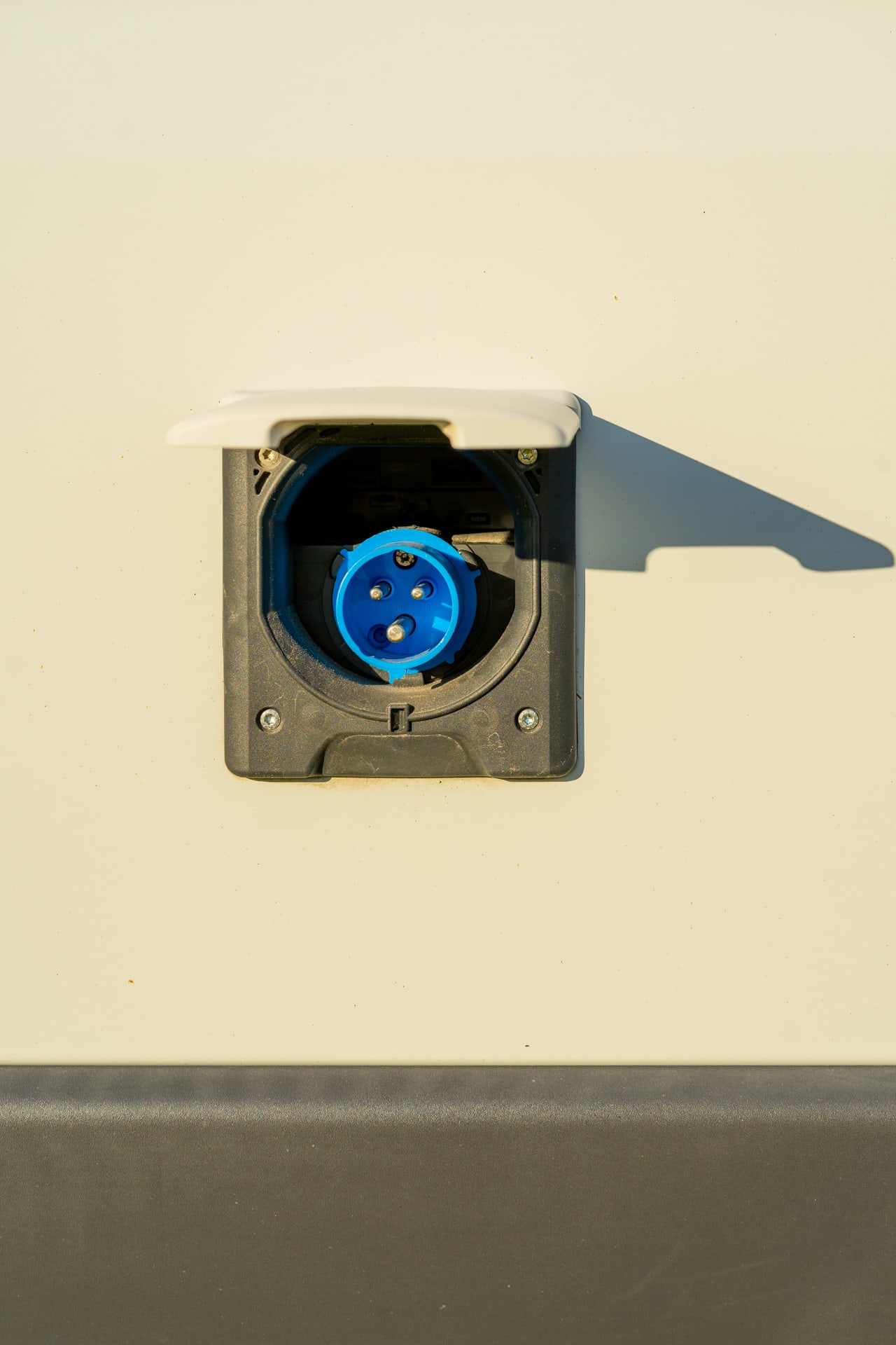 V prípade návštevy kempu, je tu možnosť pripojenia sa na extérny zdroj elektriky. Z vonkajšej strany auta je zásuvka na 230V. V karavane je na to určený kábel aj predlžovačka. Pokial budete v kempe, môžete napojiť a elekriku aj silnejšie spotrebiče.