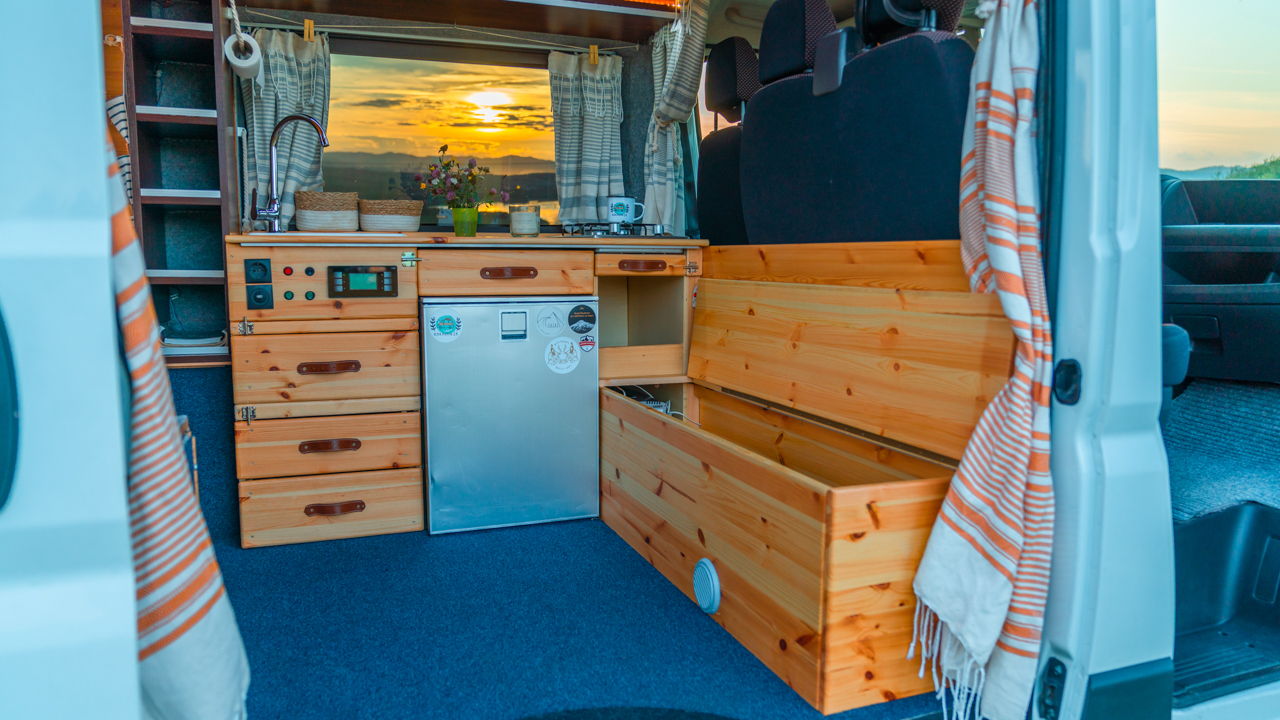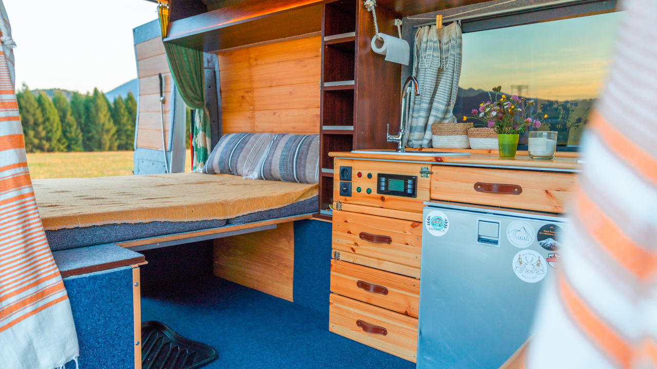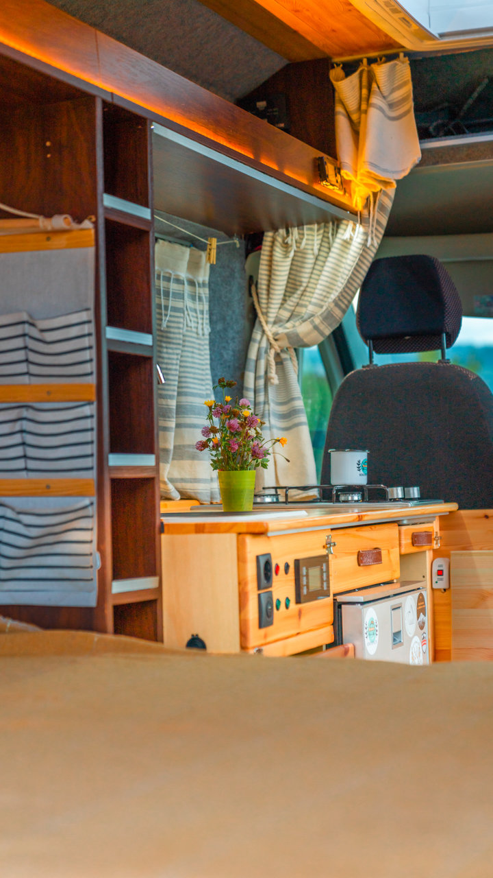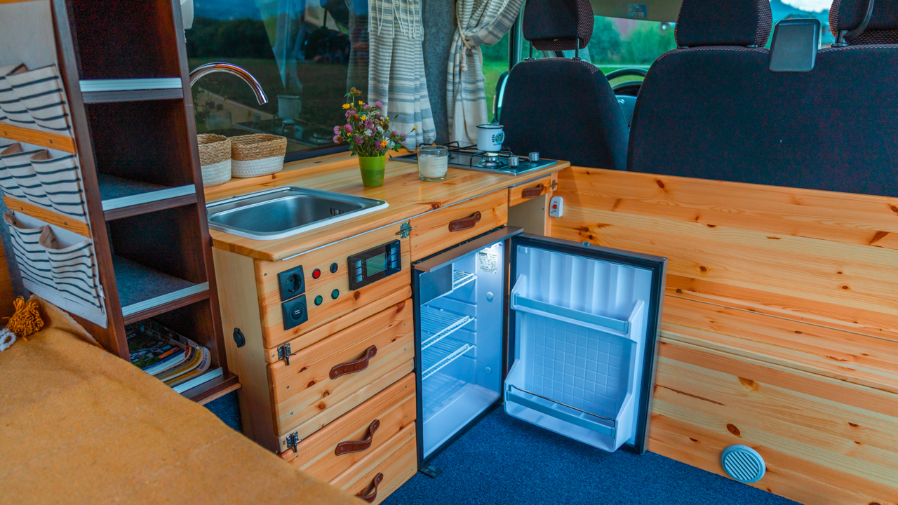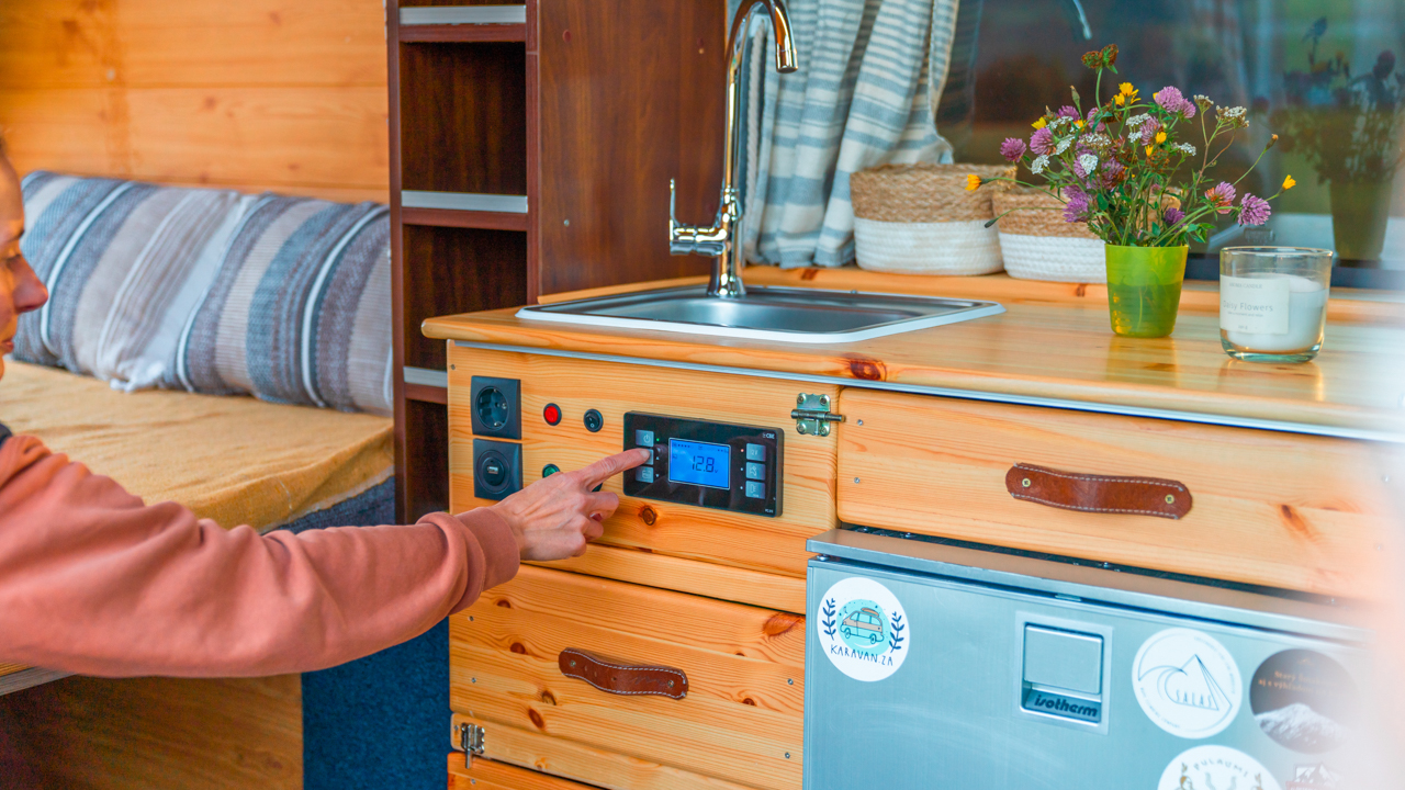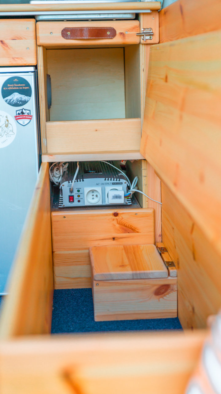 Na streche karavanu sú solárne panely (300w) a vo vnútri dve extra autobatérie, na ktoré frčí celý interiér vanu. Autobatérie sa dobíjajú solárnym panelom alebo za chodu vozidla. Vďaka meniču napätia (1600W) sú vo vane dve zásuvky na 230V plus 3 USB porty. Bez problémov si tu nabijete notebook, baterku do fotoaparátu alebo dronu, prenosný reprodktor či telefón. Neutiahne to však fén na vlasy alebo rýchlovarnú kanvicu. Najlepšie je dobíjať Vašu elektroniku počas jazdy.
