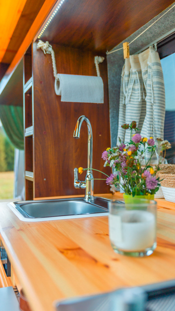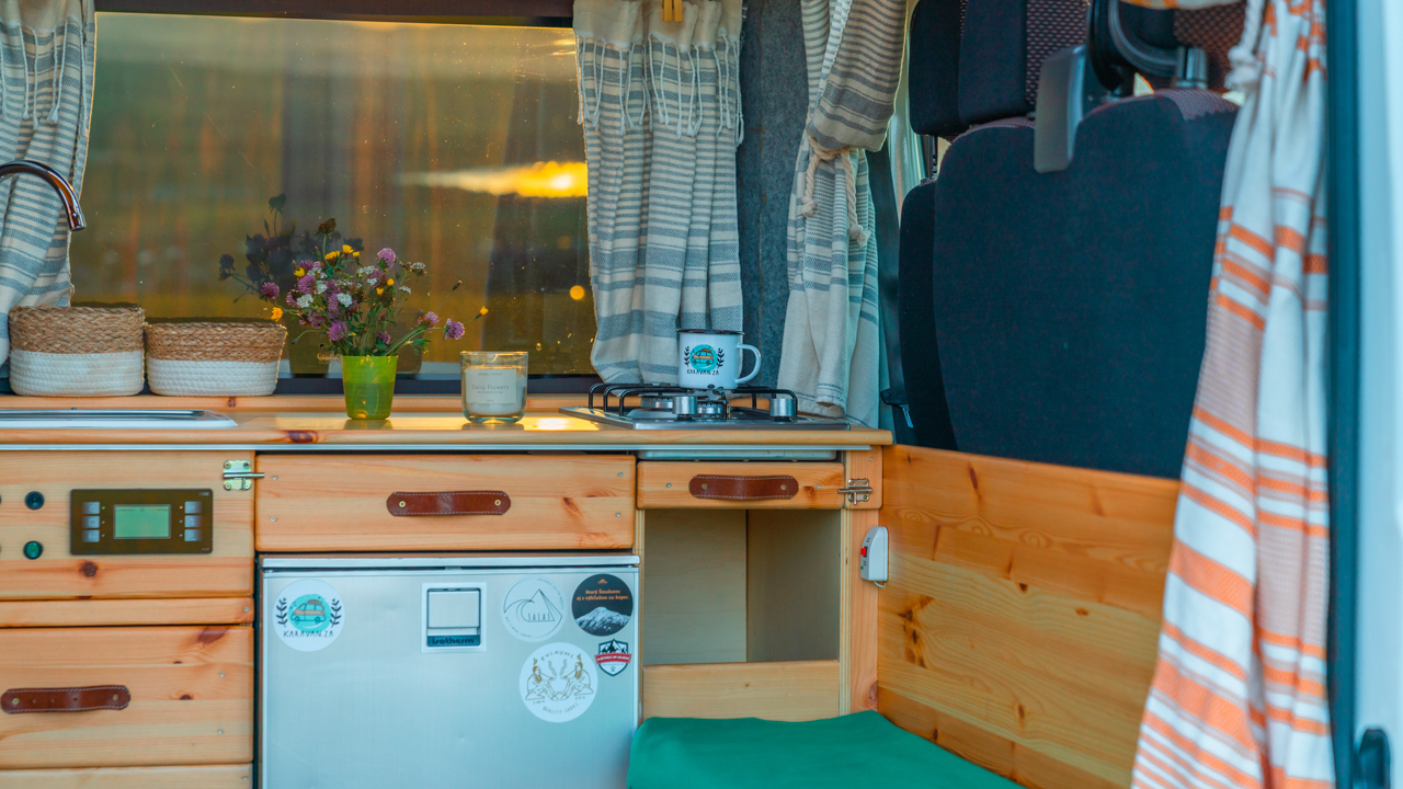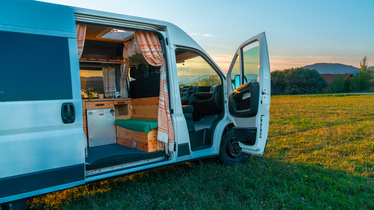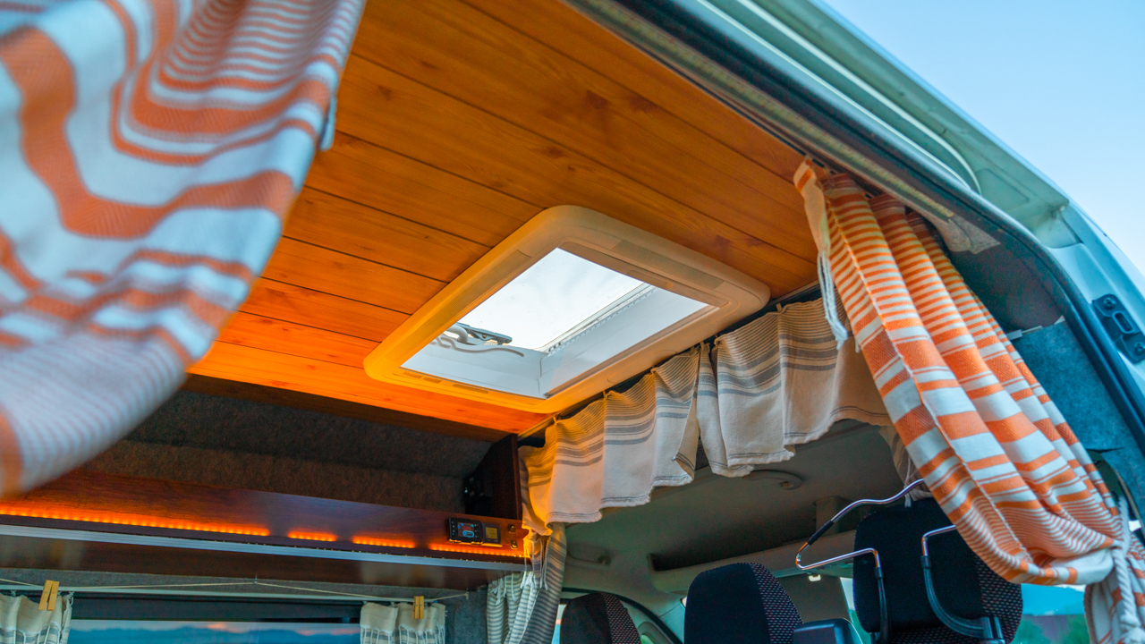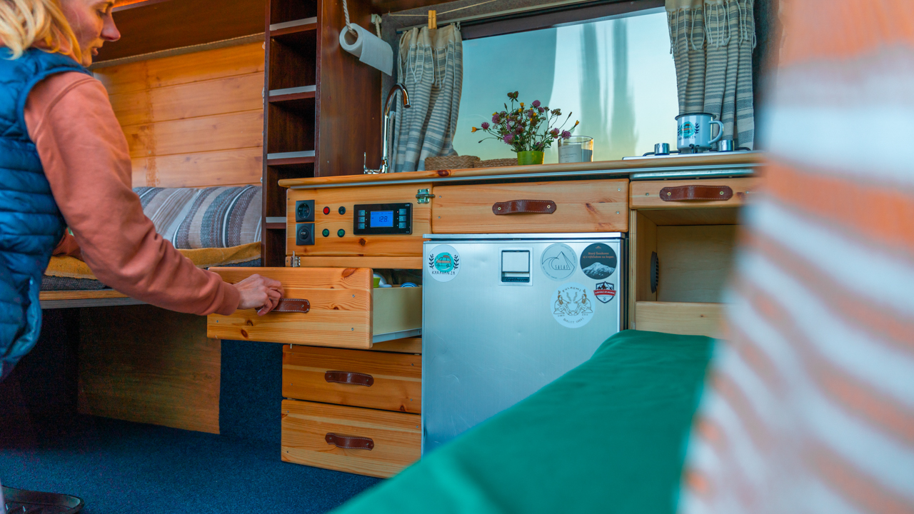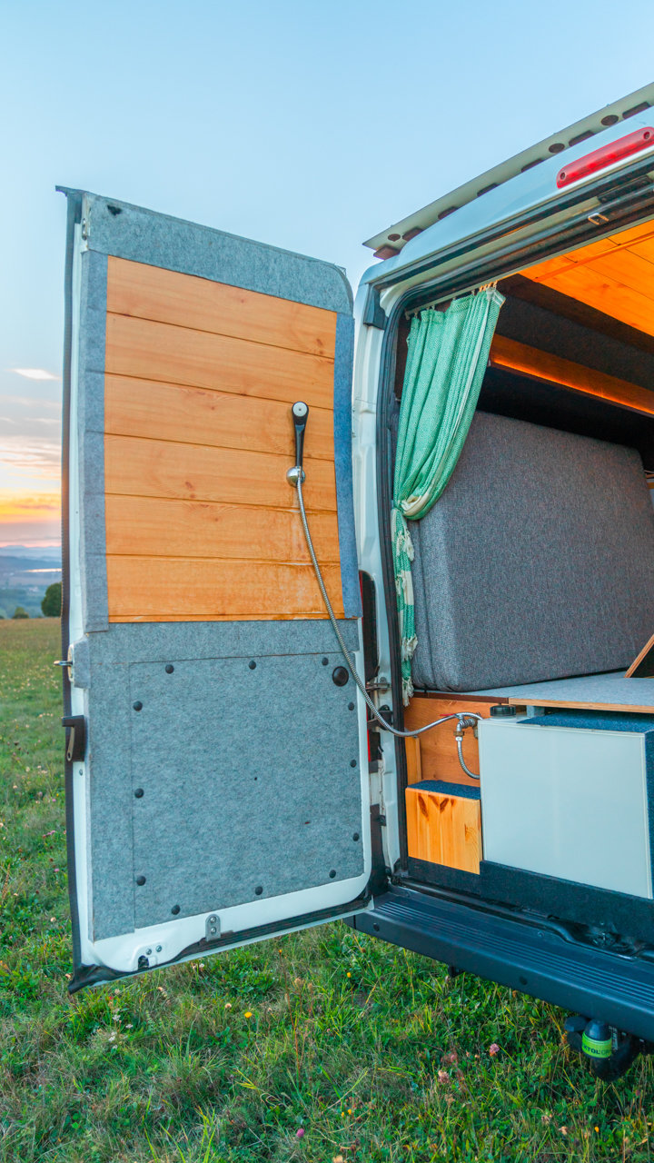 Na streche karavanu sú solárne panely (300w) a vo vnútri dve extra autobatérie, na ktoré frčí celý interiér vanu. Autobatérie sa dobíjajú solárnym panelom alebo za chodu vozidla. Vďaka meniču napätia (1600W) sú vo vane dve zásuvky na 230V plus 3 USB porty. Bez problémov si tu nabijete notebook, baterku do fotoaparátu alebo dronu, prenosný reprodktor či telefón. Neutiahne to však fén na vlasy alebo rýchlovarnú kanvicu. Najlepšie je dobíjať Vašu elektroniku počas jazdy.