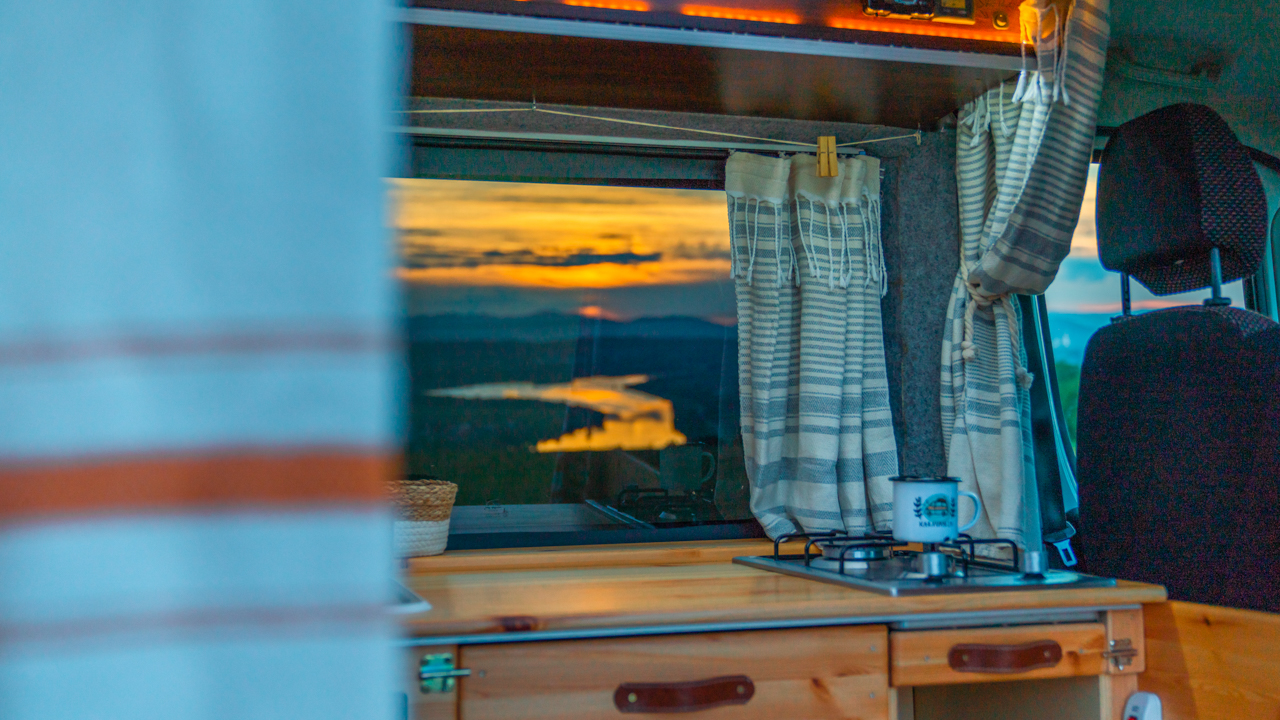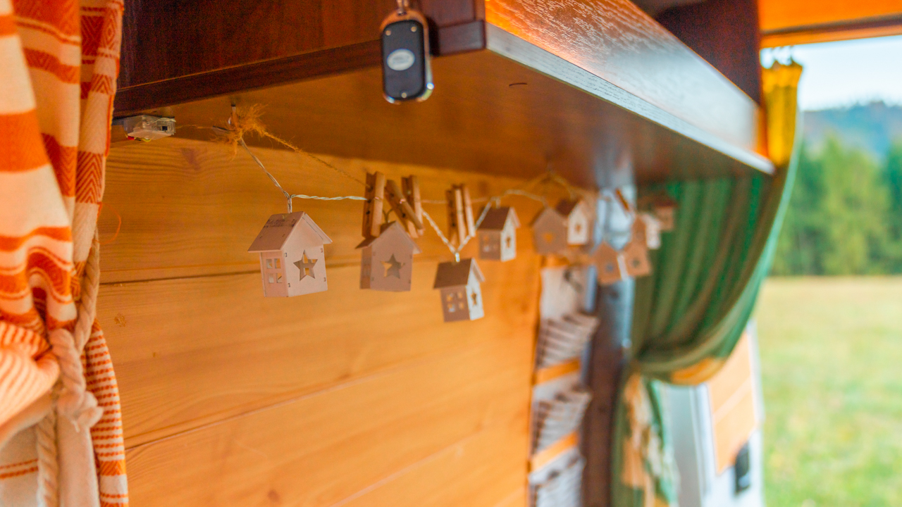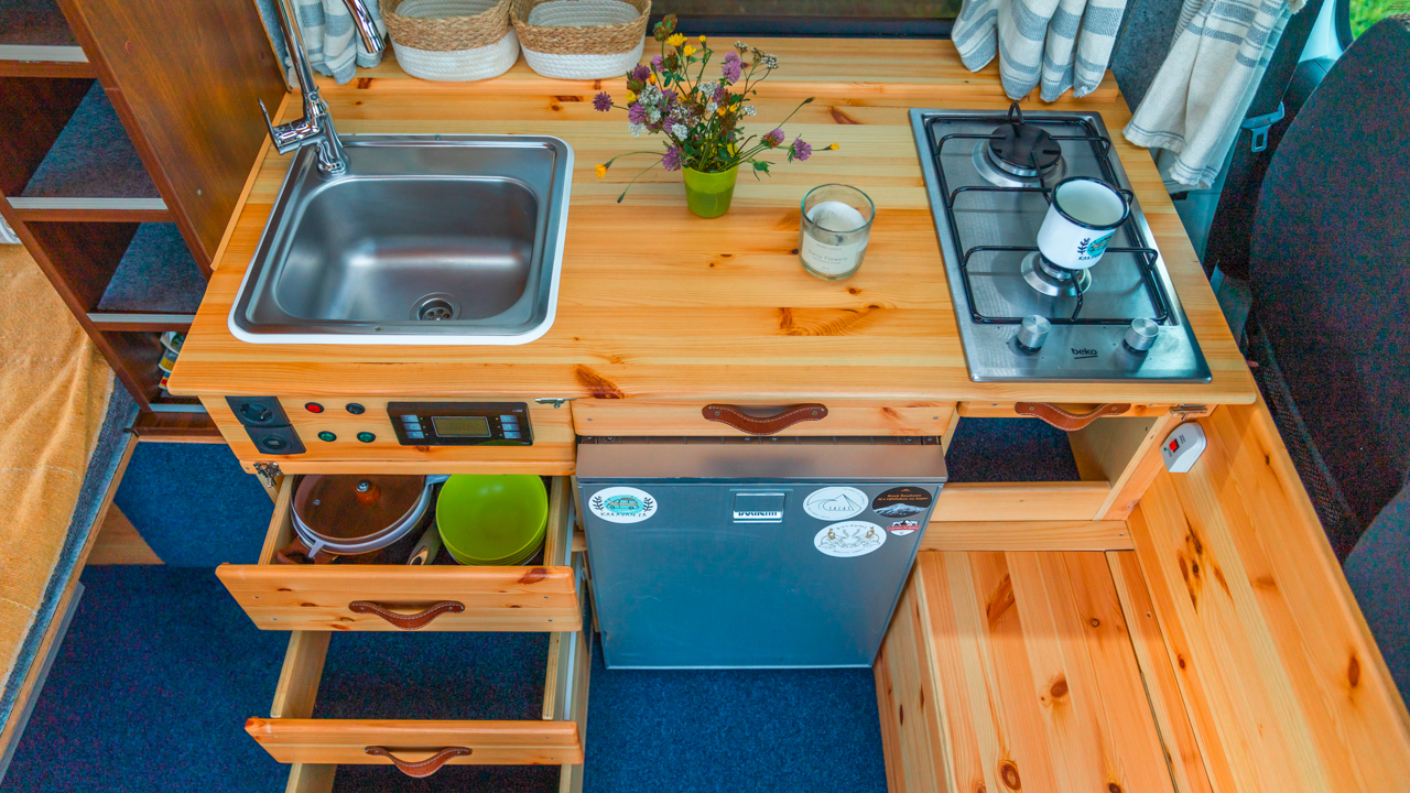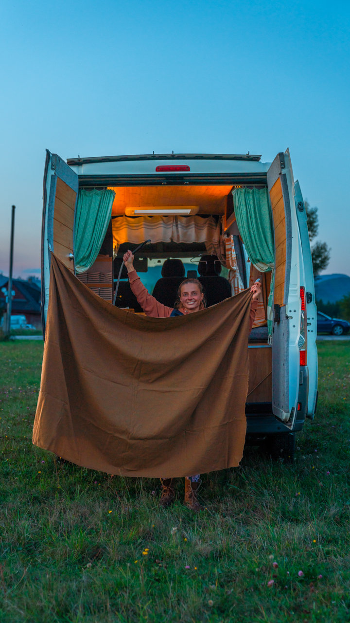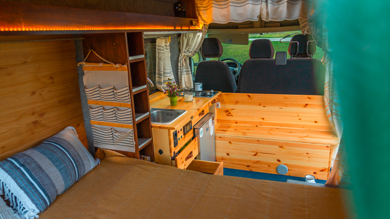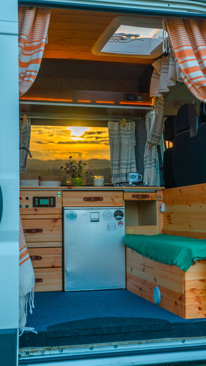 Na streche karavanu sú solárne panely (300w) a vo vnútri dve extra autobatérie, na ktoré frčí celý interiér vanu. Autobatérie sa dobíjajú solárnym panelom alebo za chodu vozidla. Vďaka meniču napätia (1600W) sú vo vane dve zásuvky na 230V plus 3 USB porty. Bez problémov si tu nabijete notebook, baterku do fotoaparátu alebo dronu, prenosný reprodktor či telefón. Neutiahne to však fén na vlasy alebo rýchlovarnú kanvicu. Najlepšie je dobíjať Vašu elektroniku počas jazdy.