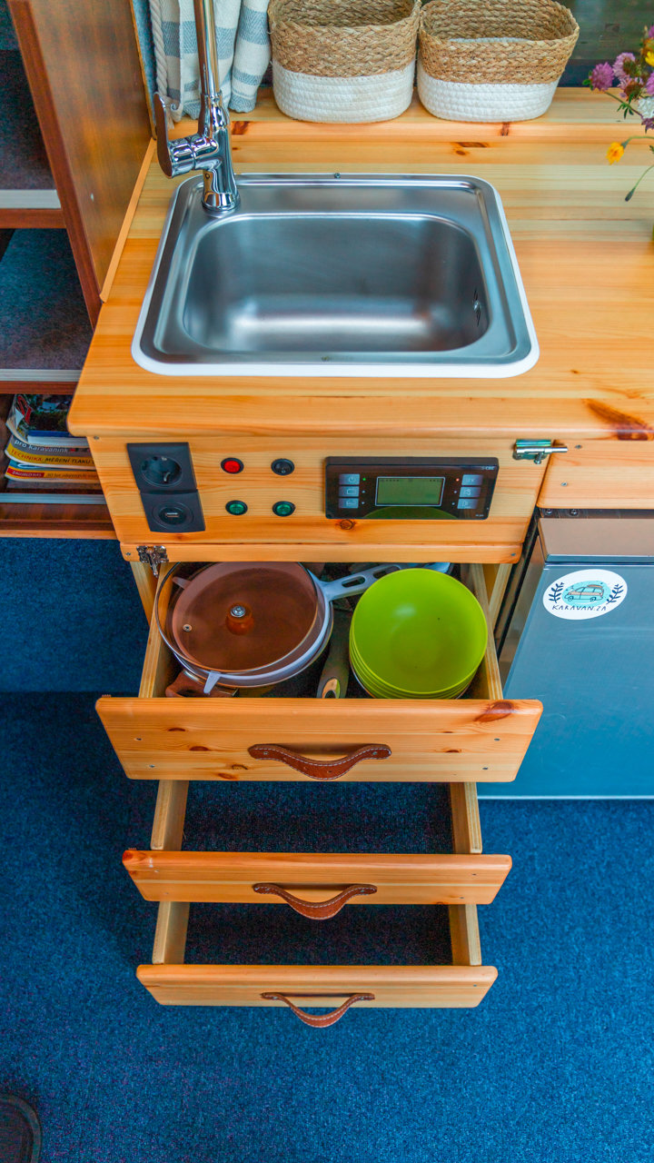 - Pitnú vodu vo fľaškách, na umývanie a varenie je 90 litrová nádrž