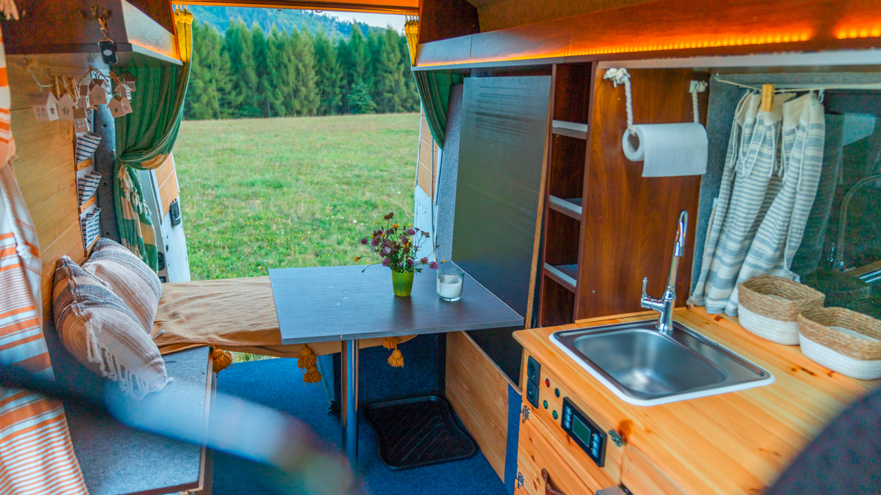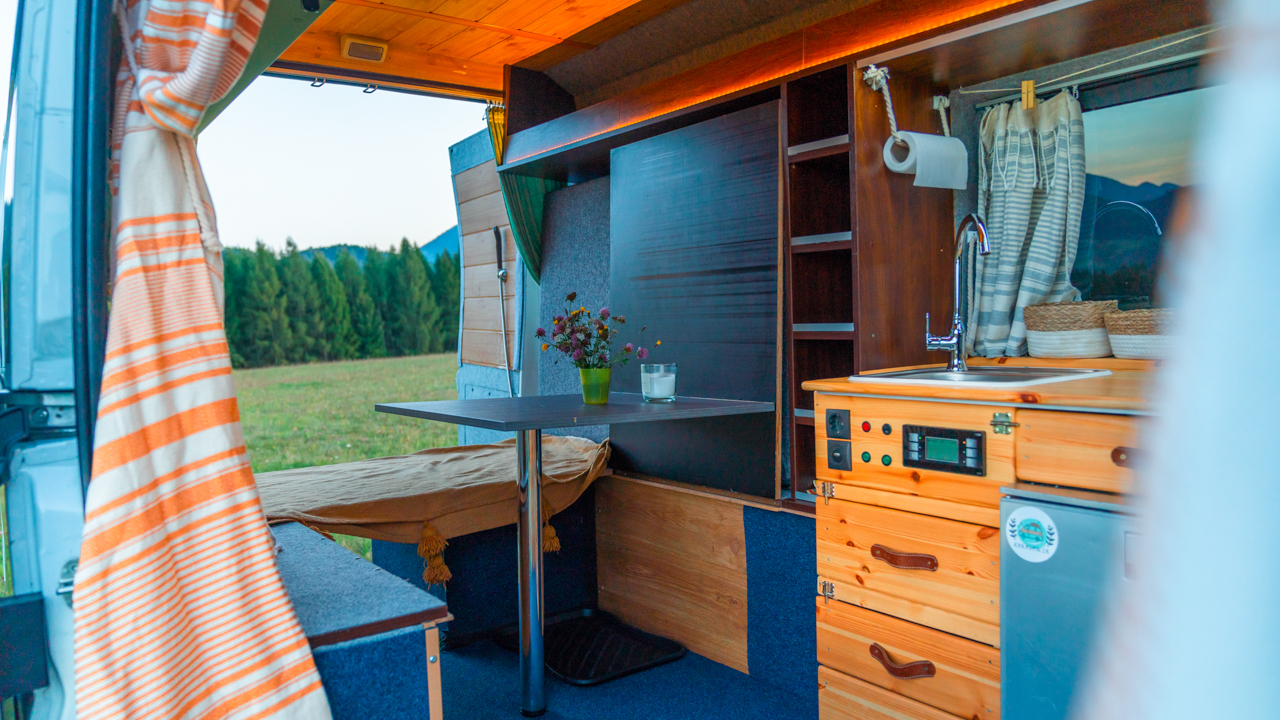 - Rozkladací stôl so sedením vo vnútri karavanu